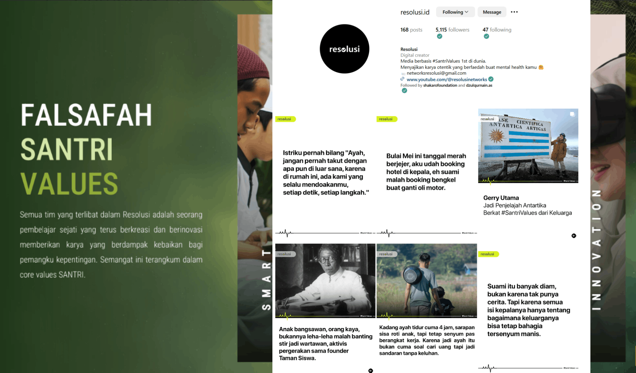 Rejuvinasi pada Agustus 2024, semula 289 follower,  Q1 2025 naik jadi 5.115 organic followers dan akan terus berkembang. Alasan #SantriValues, karena Santri adalah pembelajar sejati yang relevan dengan jati diri manusia yang selalu tumbuh, belajar dengan ilmu, hikmah atau nilai-nilai kebaikan yang melekat dalam hidupnya.
